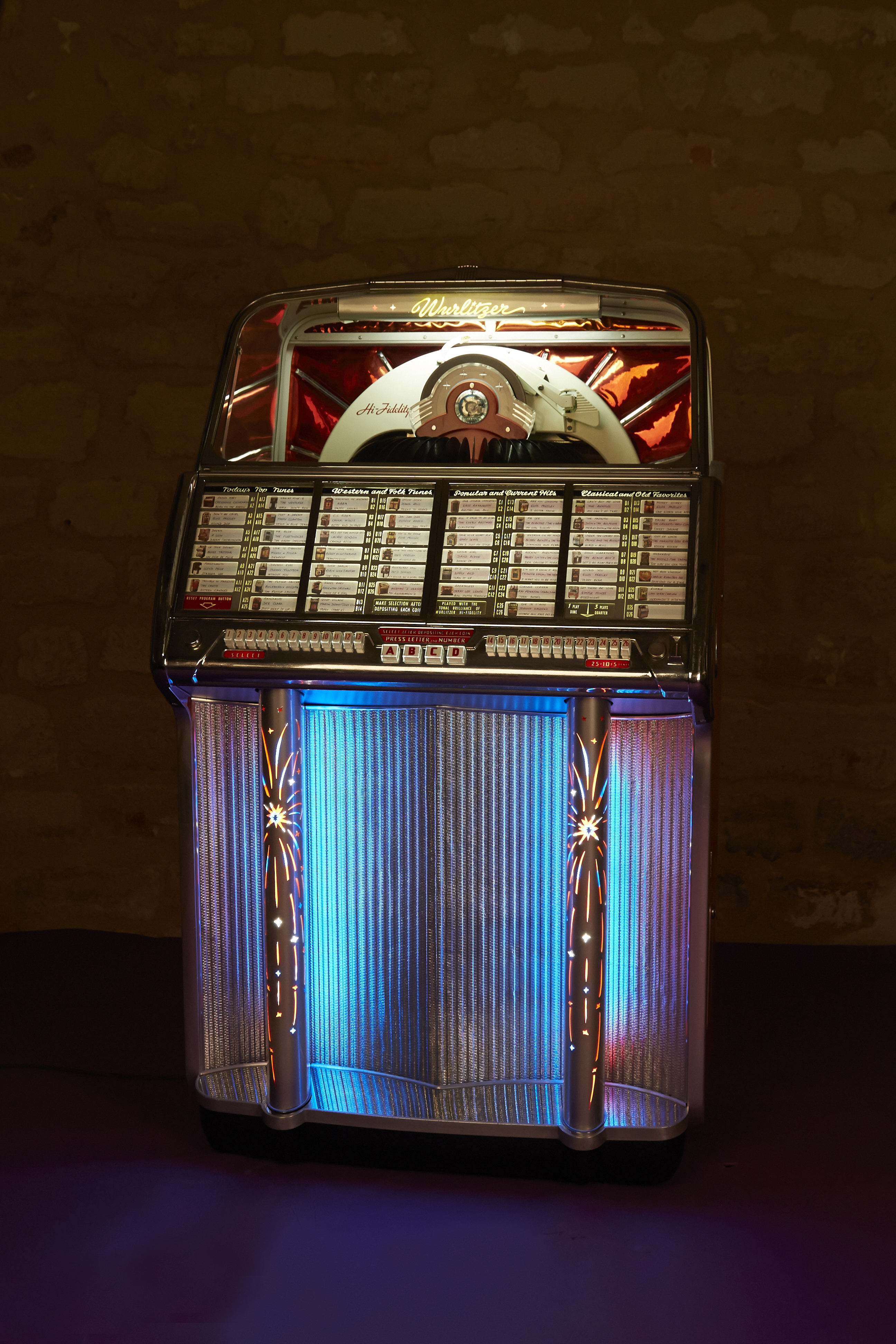 Wurlitzer : juke-box, modèle « One more time », 2005. Réplique commémorative du modèle 1015 de 1946, réalisée à la même échelle. Système électromécanique pour disques vinyles 45 tours. Ce juke-box comprend un système complet de lecture de 50 disques, soit 100 sélections (disques fournis). Caisse en marqueterie de bois, plexiglas et garniture en plastique moulé, système d’éclairage de la façade avec des tubes d’huile et colonnes de couleurs tournantes. 153 x 85 x 65 cm. Crédit : Charlotte Studio pour FauveParis.