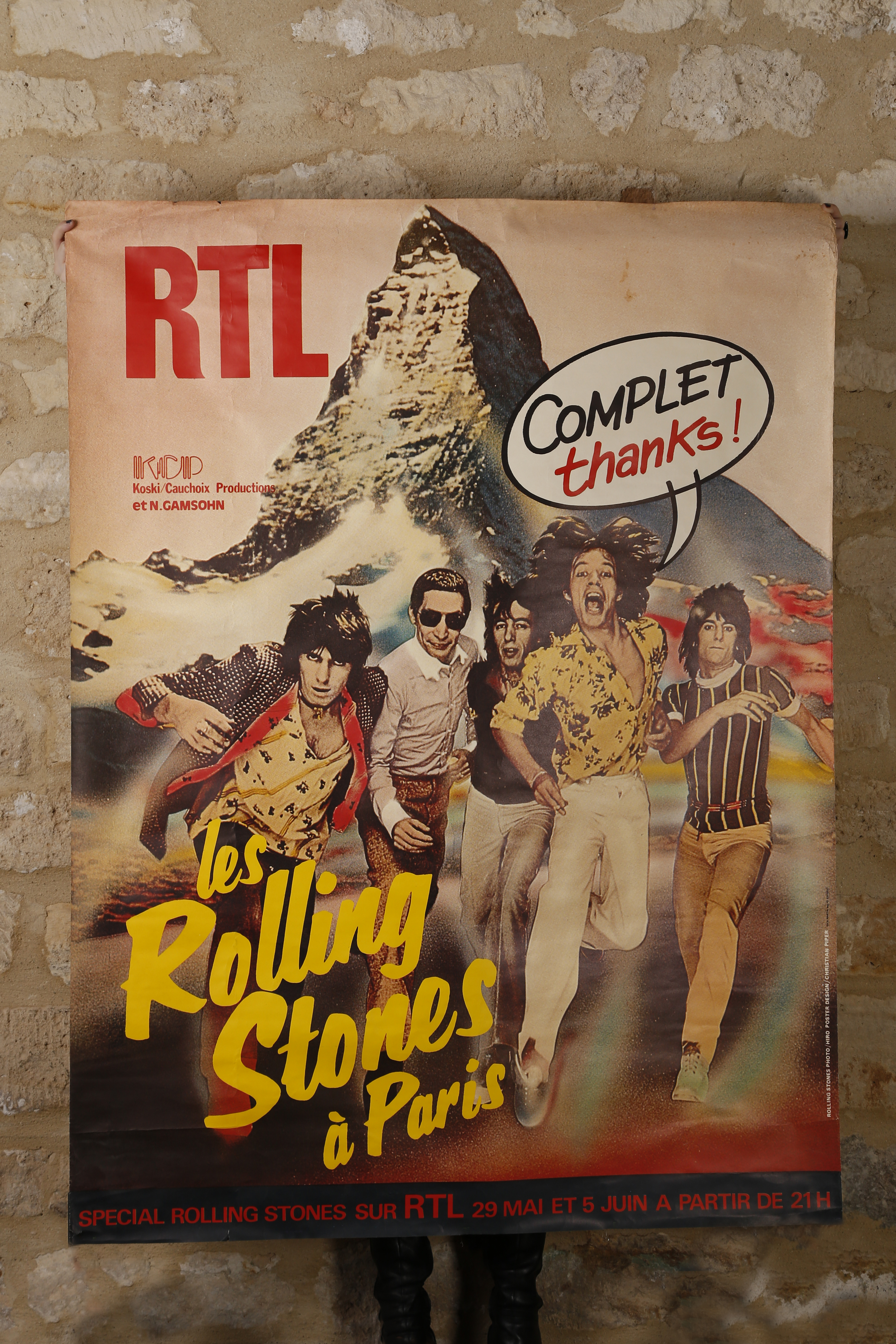 Affiche des concerts mythiques donnés par les Rolling Stones aux Abattoirs de La Villette les 29 mai et 5 juin 1976, au cours de la première tournée européenne avec Ron Wood. Photo par Hiro. Imprimerie St-Martin (Asnières). 115 x 117 cm. Crédit : Charlotte Studio pour FauveParis.