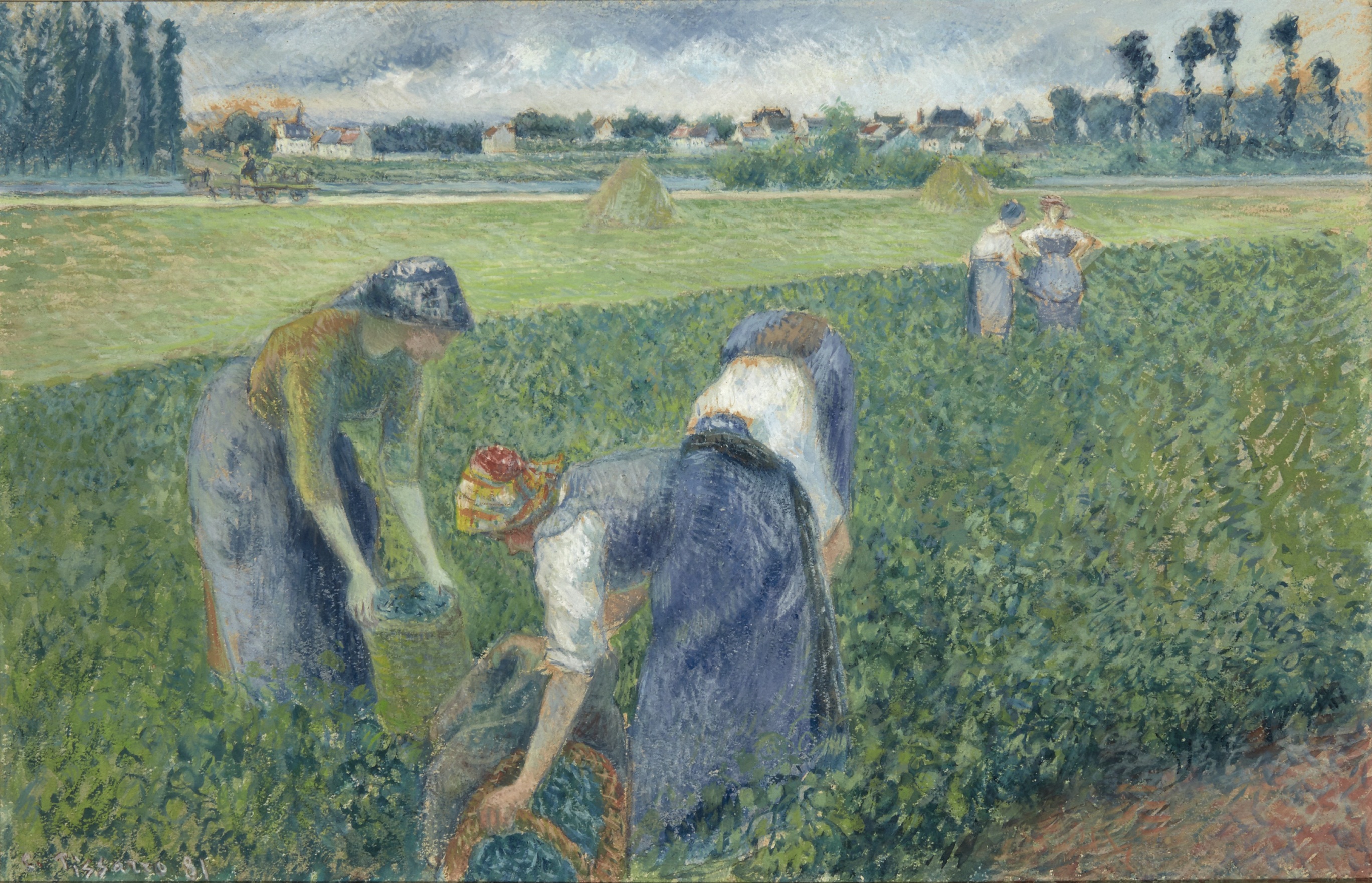Paysannes travaillant dans les champs, Pontoise par Camille Pissarro, 1881, gouache et pierre noire sur papier, 32,2 x 49,7 cm. Estimée 250.000/350.000 euros, l’œuvre est échangée contre 1,38 million. Crédit photo : Christie’s.