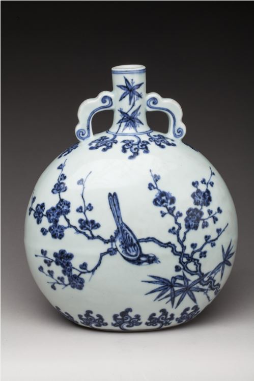 Un modèle proche de cette pièce, à décor de camélias, d’époque Yongle, est situé dans les collections du Musée Guimet (collection Grandidier). Les deux gourdes présentent notamment le même fêle de cuisson.