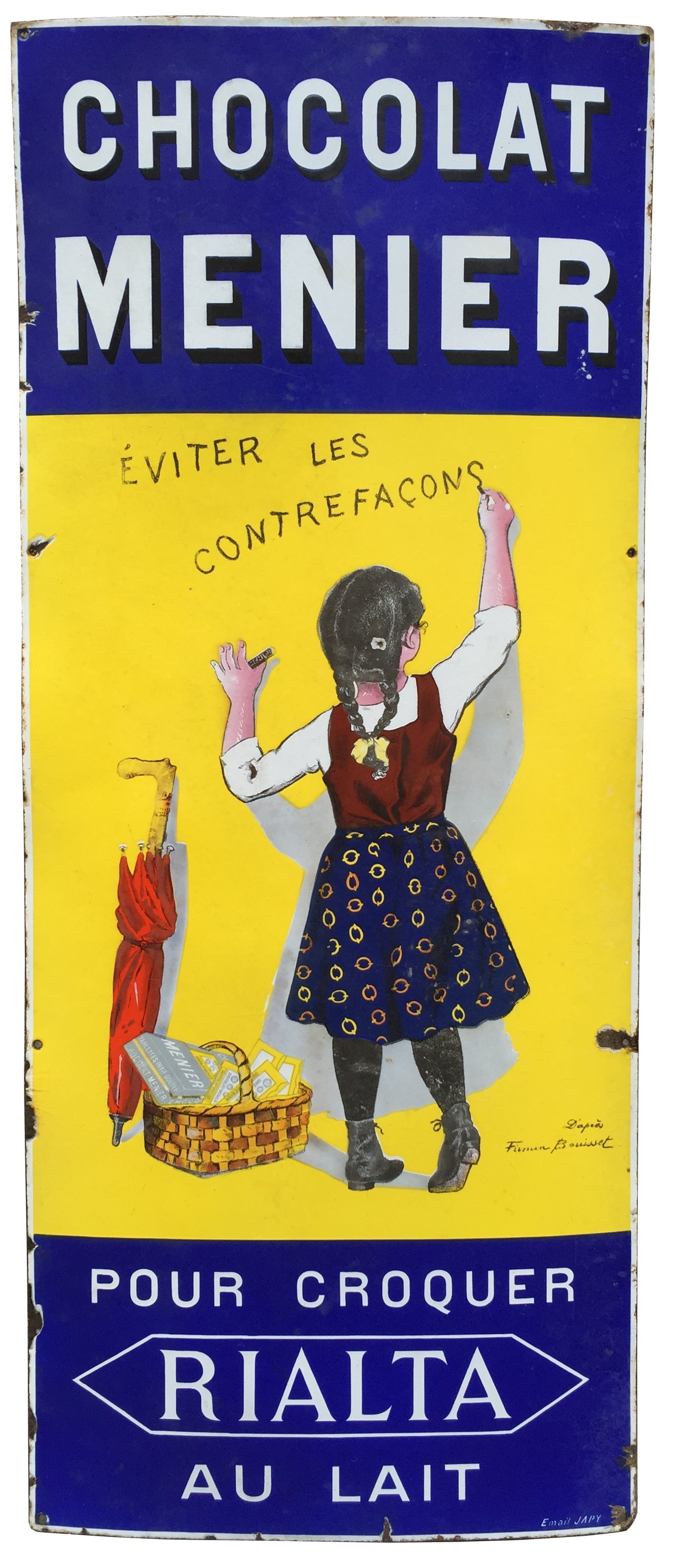 Chocolat Menier Rialta : plaque émaillée dans sa version étroite, signée Firmin Bouisset (1859-1925). Émail Japy. 50 x 120 cm. Estimation : 15.000/20.000 euros. Adjugée 37.500 euros. Crédit photo : Salorges Enchères.