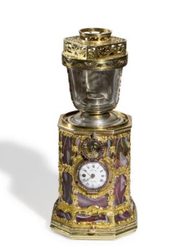 Cette pendulette cage dissimulant un photophore, en or, argent et agate, réalisée par James Cox vers 1770 pour le marché chinois, est l’une des plus grandes raretés de cette vente. En dehors de la réputation prestigieuse de l’horloger londonien et de la qualité du travail d’orfèvrerie, les tons rouges et les veinures de la pierre invitant à la contemplation sont un plus pour le goût chinois. Cette pièce faisait originellement partie d’un ensemble de quatre, très similaires quant à la forme et au décor. Deux d’entre elles, présentant des différences avec celle-ci, dont l’absence d’un oculus supplémentaire et d’un sertissage de grenats, et l’utilisation d’agate brune au lieu de rouge pour l’exemplaire présenté par Artcurial, font partie des collections du musée impérial de Pékin. Une troisième, pendant de celle d’Artcurial, a été située dans le commerce de l’art. Compte tenu de la rareté de ce type d’objets sur le marché, l’estimation de 90.000/180.000 euros est attractive. Hauteur (ouverte) : 16 cm. Photo : © Artcurial.