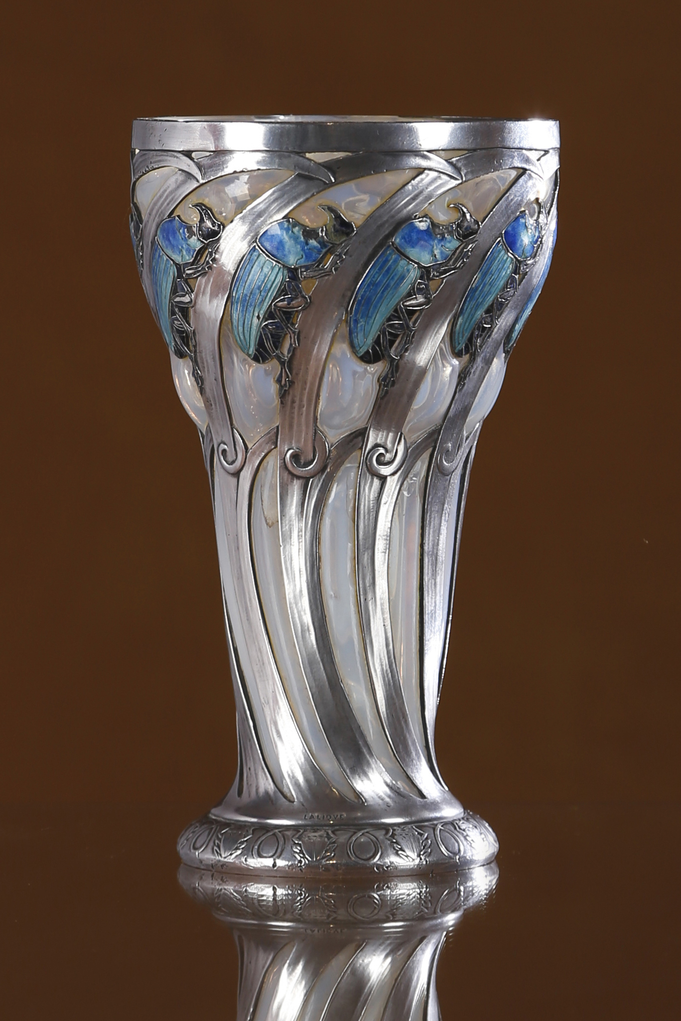 Pour Amélie Marcilhac, experte de la vente et spécialiste de l’œuvre de René Lalique : « il s’agit là d’une des pièces les plus spectaculaires de René Lalique. Depuis dix ans, seules trois pièces de René Lalique aussi exceptionnelles ont réapparu et ce gobelet est la quatrième. Et comme pour rendre hommage au règne animal, Lalique a gravé un coléoptère sous son socle. C’est une première.»