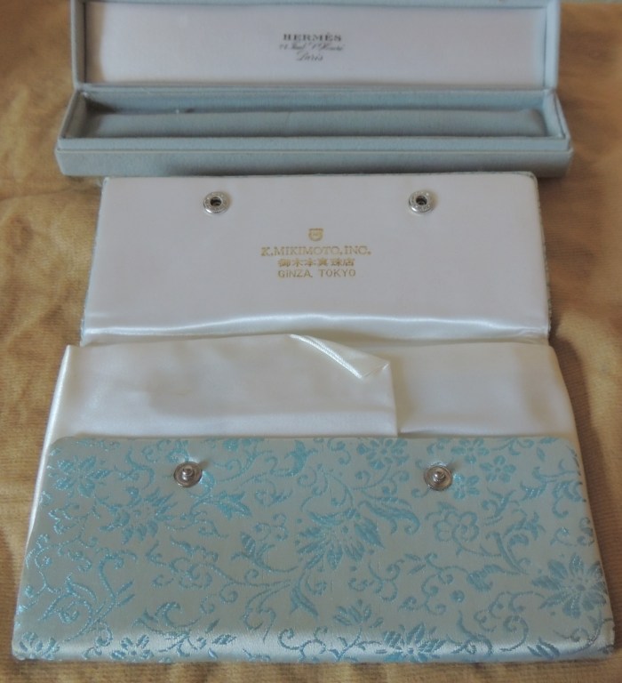 Pochette pour collier de perles Mikimoto et écrin Hermès (vers 1970). Un bijou de luxe d’occasion est valorisé par son emballage d’origine. Photo : © ArtWithoutSkin