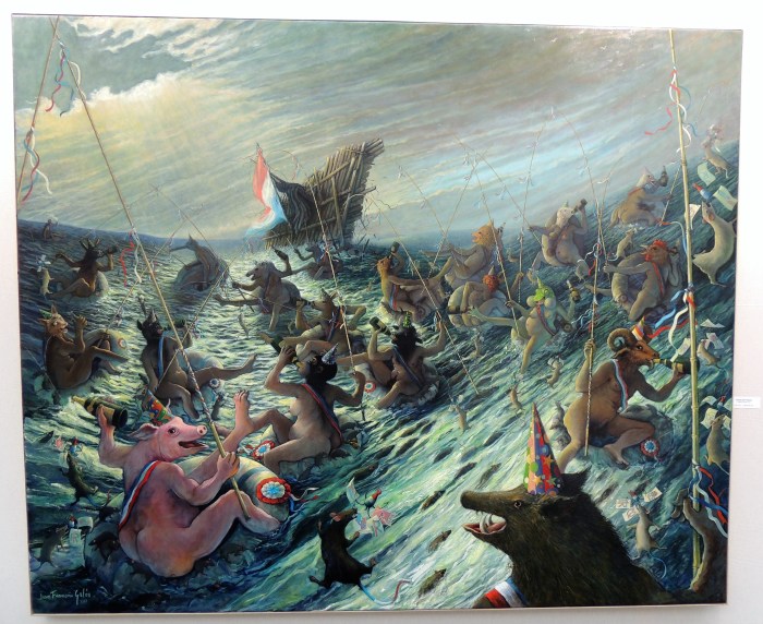 Jean-François Galéa : La Pêche aux voix, 2017, huile sur toile, 165 x 200 cm. Une des œuvres les plus « sulfureuses » de la version 2017 du Salon des Artistes Français. En 1865, Manet y exposa son Olympia, avec le retentissement que l’on sait. Son Déjeuner sur l’herbe avait par contre été refusé deux ans plus tôt.