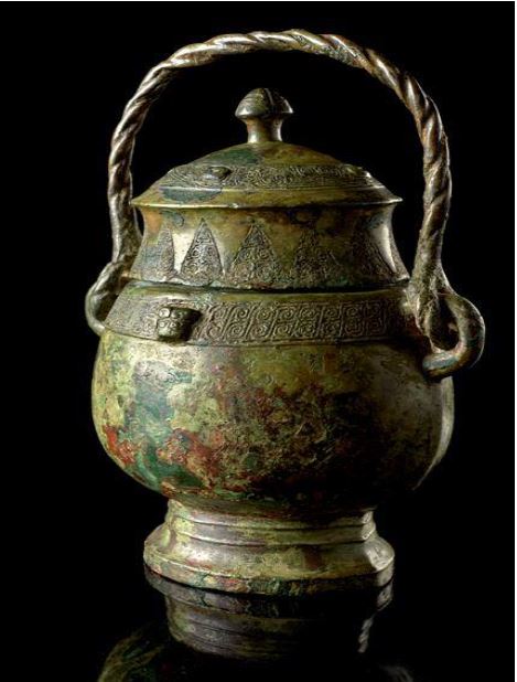 Vase à vin rituel en bronze, Chine, fin de l’époque Shang, XIII-XIème siècle avant J.-C., une des deux périodes les plus recherchées pour le genre. Formé d’une panse piriforme ovale reposant sur un pied évasé, il est orné de deux masques dits taotie (animaux fantastiques stylisés des types phœnix et dragons) en relief et situés au milieu d’une frise d’enroulements et de deux anneaux maintenant une anse torsadée mobile. Estimation attractive de €20.000-€30.000 ($22,000-$33,000). Crédit photo :