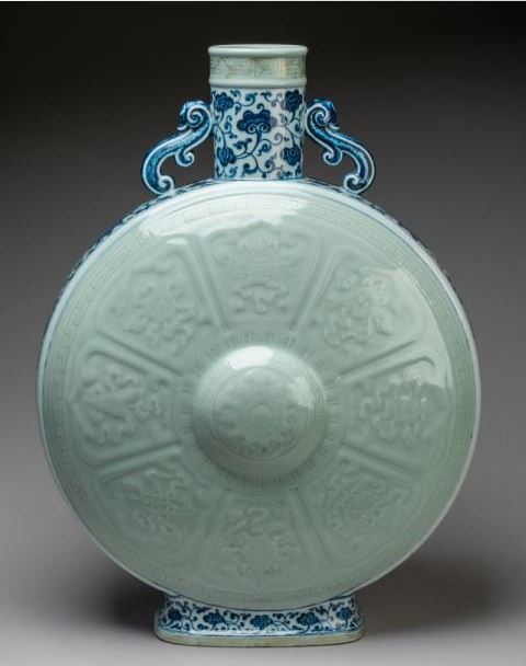 Apparue autour des débuts de la dynastie Ming dans l’histoire de la céramique chinoise, la forme de cette pièce s’inspire des gourdes en métal des pèlerins du Moyen-Orient ou des gourdes en cuir des cavaliers nomades des steppes (sources muséales divergentes). Et ce modèle est aussi connu dans l’antiquité romaine, dans une version en terre cuite (musée archéologique de Séville). C’est un classique de l’art céramique chinois sur lequel à peu près tous les genres ont été exploités, mais très généralement un seul à la fois. Cette franche combinaison du blanc bleu et du céladon pour le modèle est rare. La taille imposante et la qualité de l’exécution sont aussi exceptionnelles.