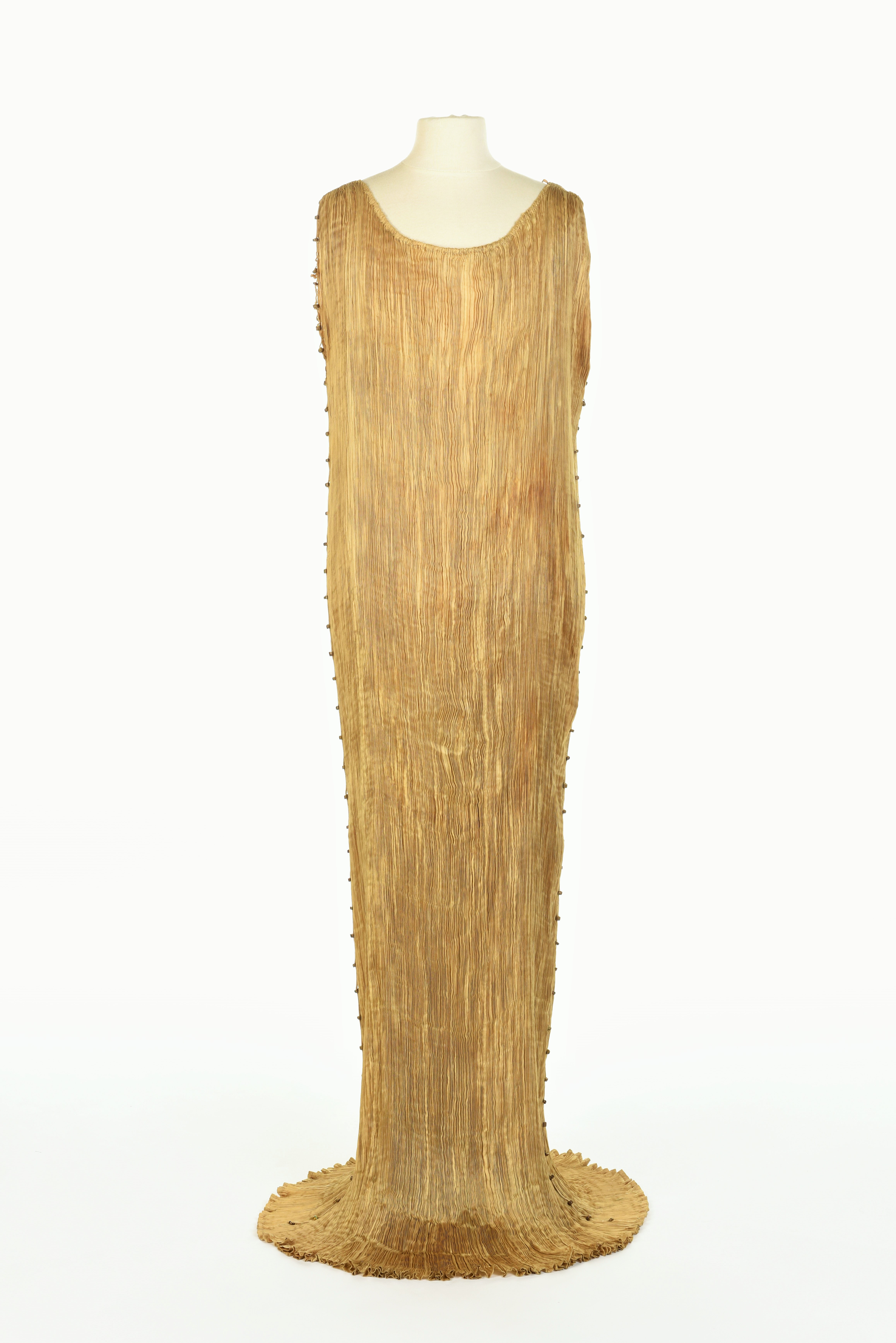 Mariano Fortuny : vers 1915/1920, Robe Delphos en pongé de soie plissée café au lait, et perles de Murano. Griffe dans un ourlet intérieur « Mariano Fortuny Venise ». Très bel état. Collection Gilles Labrosse. Photo : étude Sadde-Collette, Moulins