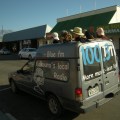 Installation de têtes de mannequins sur le véhicule de la radio locale Blue FM à Kaikoura (Nouvelle-Zélande) ; elle donne l’illusion que les têtes de personnes debouts à l’intérieur en ont transpercé le toit.